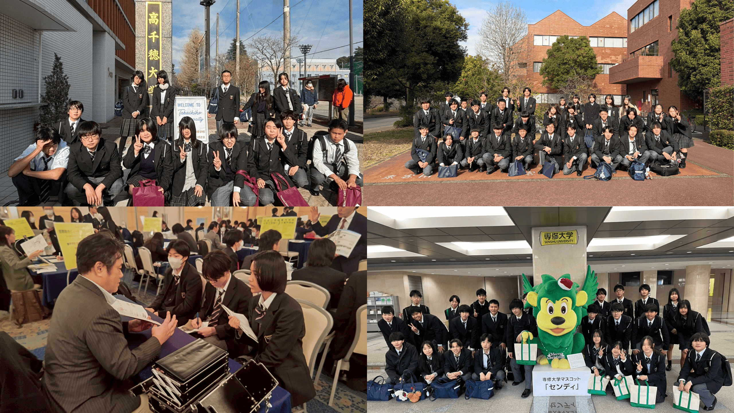 今回は高千穂大学、桜美林大学町田キャンパス、専修大学生田キャンパス、文教大学湘南キャンパス、東プレ株式会社相模原事業所の5か所に分かれて見学を実施しました。午後はレンブラントホテル海老名に会場を移し、会場型進路ガイダンスへ参加しました。