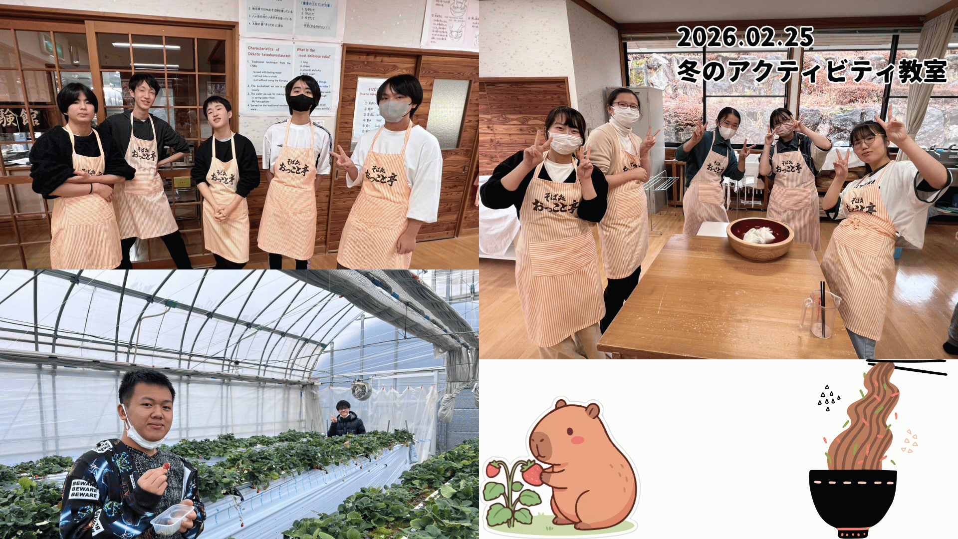 冬のアクティビティ教室 1日目 本日より2泊3日の行程で、姉妹校の柏木実業専門学校と合同で「冬のアクティビティ教室」を実施しています。長野県富士見町にある柏木学園長野富士見研修所に宿泊して、ウインタースポーツやそば打ち体験などを実施します。現地の様子を3日間にかけてお伝えしていきます。本日はそば打ち体験といちご狩りを実施した様子をお伝えします。